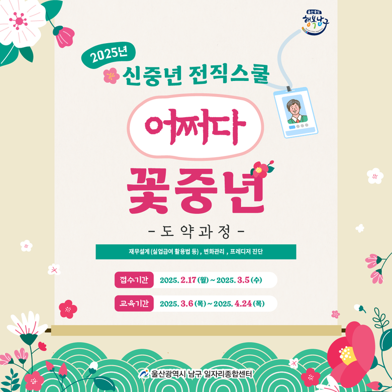 [남구 세계타임즈=이호근 기자] 남구 일자리종합센터는 오는 3월 6일부터 4월 24일까지 센터 4층 교육장에서 신중년전직스쿨 ‘어쩌다 꽃중년 도약과정’을 운영한다고 밝혔다.