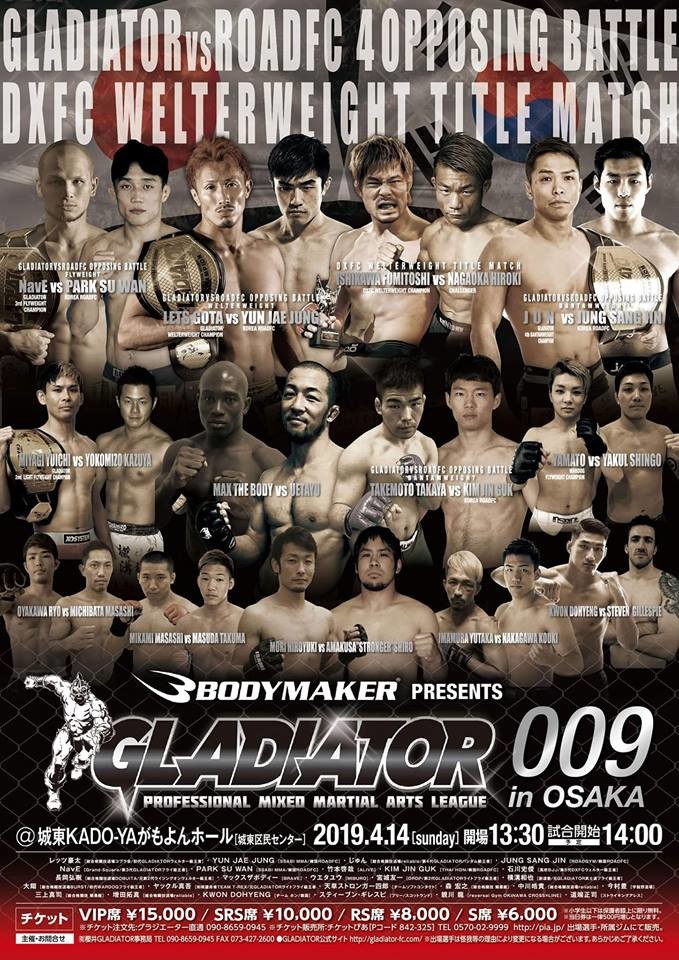 정상진은 GLADIATOR 009 in OSAKA 메인 이벤트에 출전, 준과 맞대결을 펼친다. 이어 코메인 이벤트에는 정윤재가 출격해 고타 야마시타와 대결한다. 박수완은 마사유키 와타나베와, 김진국은 타케야 타케모토와 각각 경기를 치른다.
