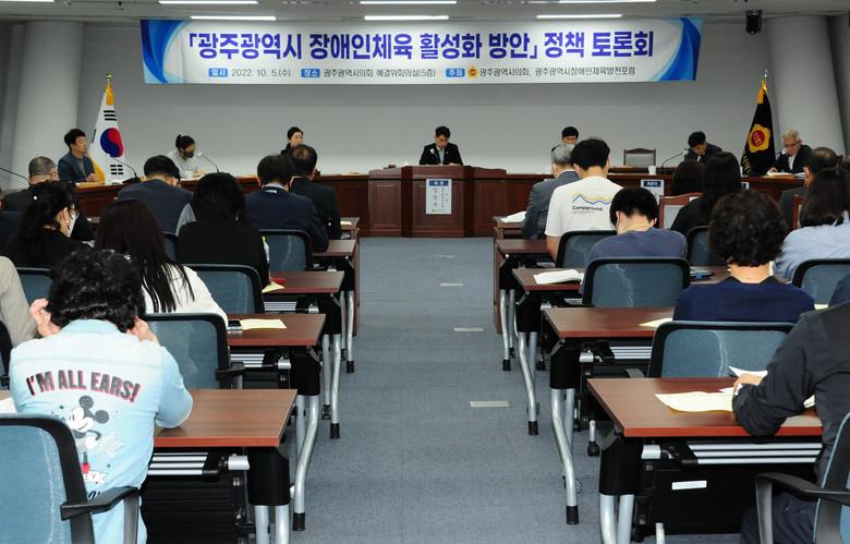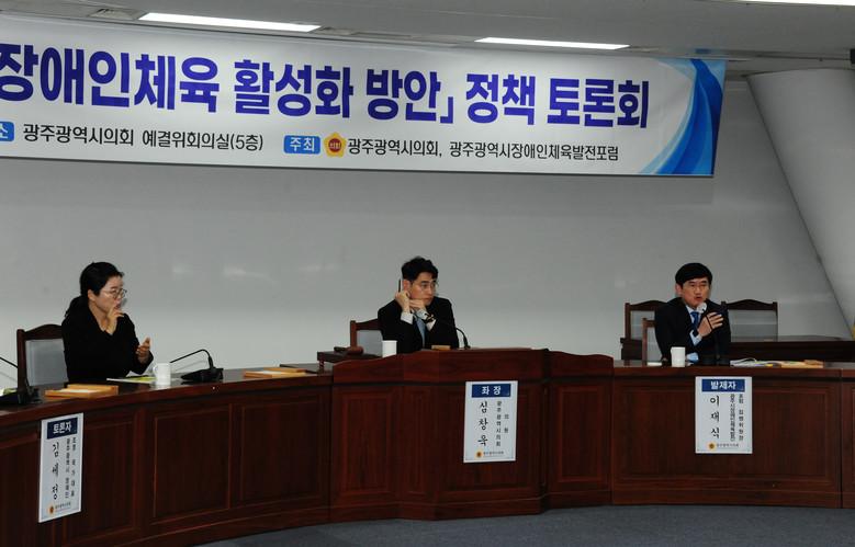 심창욱 의원이 좌장을 맡아 진행하였으며 발제는 이재식 광주광역시 장애인체육발전포럼 집행위원장이 그리고 토론자는 안재찬 광주대학교 스포츠과학부 교수, 조재관 광주시 장애인탁구팀 감독, 김세정 광주시 장애인 조정 국가대표가 참석했으며 광주시에서는 이부호 체육진흥과장이 토론자로 참석했다.