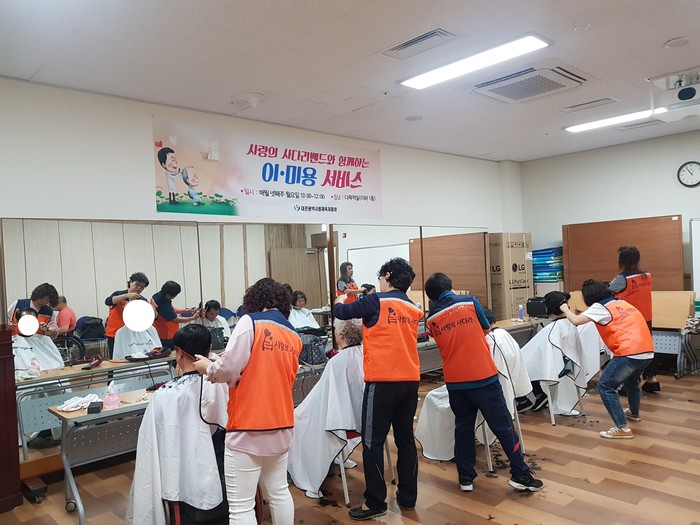 이날 미용봉사에는 김미경, 김현옥, 송남석, 이하영, 조은숙 가위천사들이 대전시체육재활원 30명의 장애인들에게 미용봉사를 하였다.