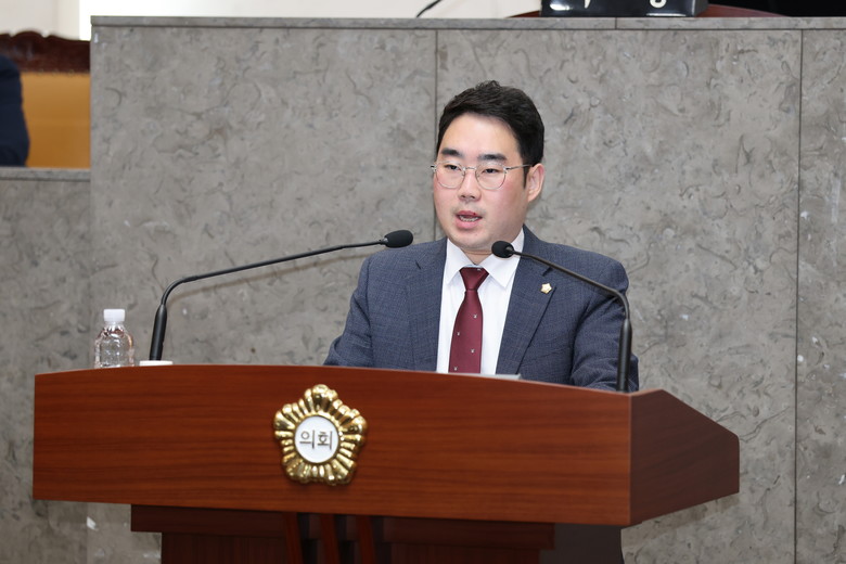 ▲ 1일차 마지막 구정질문에 나선 장규권 의원은 약 101억 원이 투입된 금빛공원 열린광장 조성 사업의 문제점을 집중 지적했다. 장 의원은 조경공사 과정에서 기존의 굵은 수목이 재이식되지 않고 작은 나무만 대량 식재돼 그늘 부족 현상이 심각하며, 배수로 시설 부실로 우기 전부터 침수 피해가 발생했다고 밝혔다. 또한 자율방범대초소와 맑은누리 작은도서관의 활용 문제, 야간 조명 부족 등 세밀하지 못한 정책 추진을 비판하며, 개선 대책을 촉구했다. 이어 대명여울빛거리시장 내 옥외영업 관리 문제에 대해, 위생과가 옥외영업장에 시정명령을 내리면서 한편으로는 동일 업소의 옥외영업 면적 확대 신고를 승인한 이중 행정과 형평성 결여를 지적하고, 주민 불편 민원 해소와 공공이익·안전을 고려한 합리적 대책 마련을 요구했다.