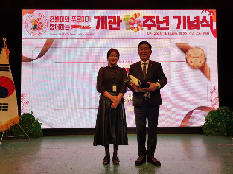 [대전 세계타임즈=이채봉 기자] 대전시의회 이효성 의원(복지환경위원장, 국민의힘, 대덕구1)이 11월 14일 열린 대전광역시어린이회관 개관 16주년 기념식에서 어린이 복지 증진과 회관 발전에 기여한 공로로 감사패를 받았다.
