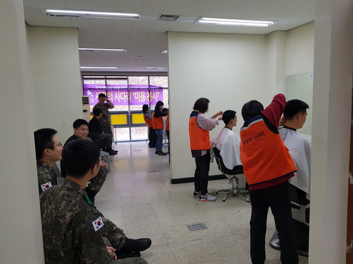 이날 미용봉사에는 송남석 단장을 비롯해서 김미경 이하영 조선옥 조은숙 가위천사들이 50명의 군장병들에게 미용봉사를 하였다.