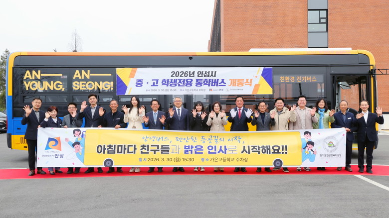 [안성시 세계타임즈=송민수 기자] 안성시는 3월 30일(월) 가온고등학교에서 대중교통 불편지역 중·고등학생들의 통학 환경 개선을 위한 ‘학생 전용 통학 순환버스 안(安)녕(YOUNG)버스’ 개통식을 개최하고 본격적인 운행에 들어갔다.