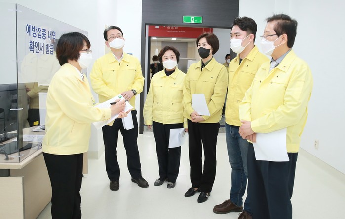 감염병 대책 특위는 중구 예방접종센터를 방문하여 지난 2월부터 시작된 요양병원과 요양시설의 입원·입소·종사자, 코로나19 치료병원 종사자 등 1차 접종대상자 4만 여명의 백신 접종현황에 대한 시 감염병관리과장의 설명을 들은 뒤, 중구보건소장의 안내에 따라 현장을 둘러보면서 향후 접종계획 및 접종 후 이상반응 관리 실태 등 백신 접종 과정 전반을 살펴보았다.