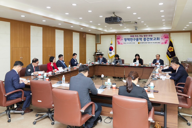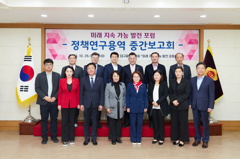 [대구 세계타임즈=한성국 기자] 대구시의회 의원연구단체 ‘미래 지속가능발전 포럼’(대표 전태선 의원)은 10월 26일(목) 오후 1시 의회 3층 회의실에서 소속단체 의원(대표 전태선, 간사 허시영, 임인환, 박우근, 김대현, 이성오, 류종우, 황순자, 권기훈, 박소영, 손한국, 이동욱, 김원규)이 참석한 가운데 의원 정책연구용역 중간보고회를 개최했다.
