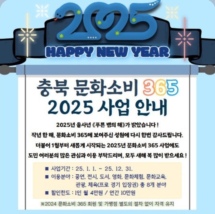 첫 번째, 민선 8기 도지사 공약사업인 문화소비 365 사업은 충북도민을 대상으로 공연, 전시, 도서, 영화, 문화체험, 문화교육, 관광, 스포츠 관람 8개 분야의 문화소비 활동에 대해 1인당 월 4만원, 연간 10만원까지 30%에 해당하는 금액을 캐시백으로 제공하는 사업이다.