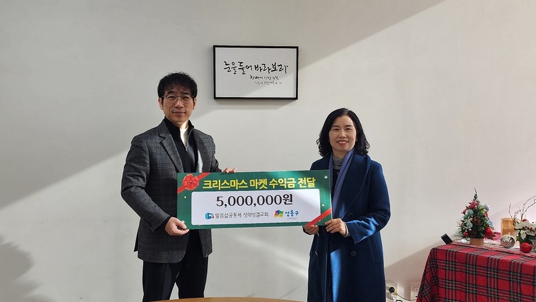 | ▲ 성락성결교회 크리스마스 마켓 수익금 전달식(왼쪽 염병호 성락성결교회 목사, 오른쪽 정은숙 성동구청 통합돌봄국장) |
