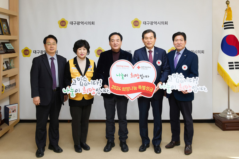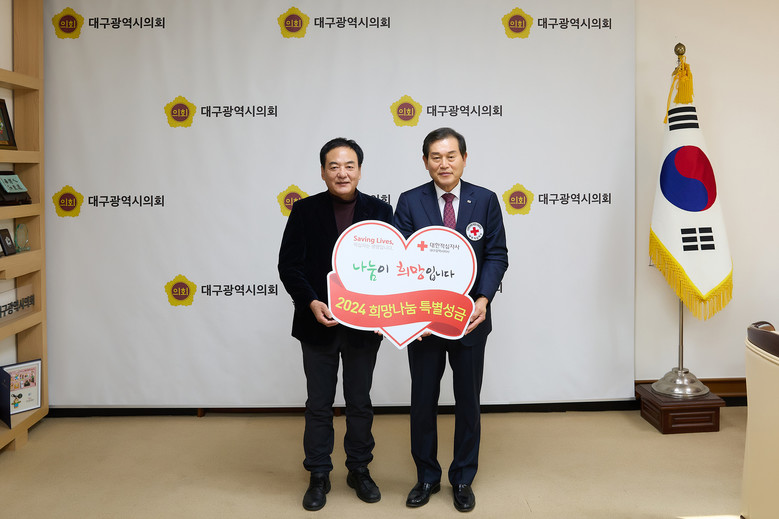 [대구 세계타임즈=한윤석 기자] 대구시의회(의장 이만규)는 12월 27일(수) 오후 2시 시의회 접견실에서 지역 내 어려운 이웃들에게 희망을 전하고 따뜻한 나눔문화 확산에 앞장서고자 대한적십자사 대구지사에 특별성금을 전달했다.