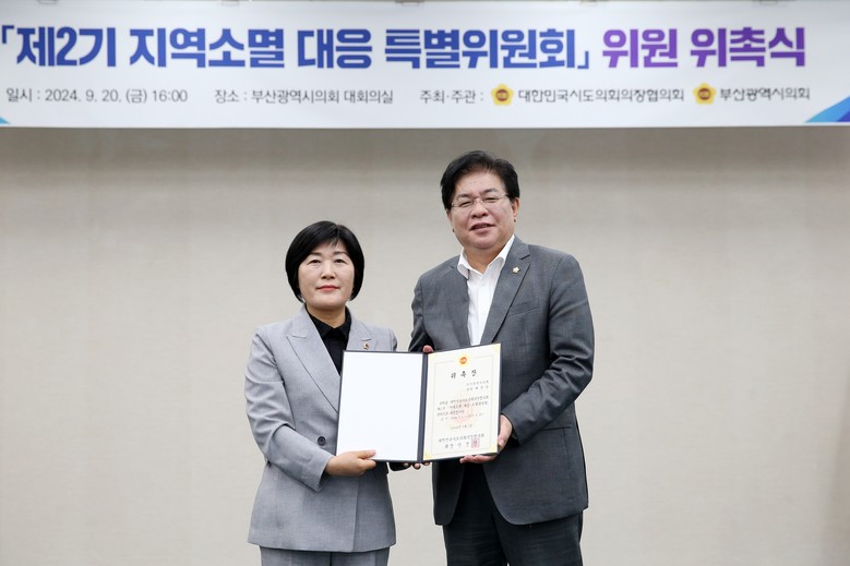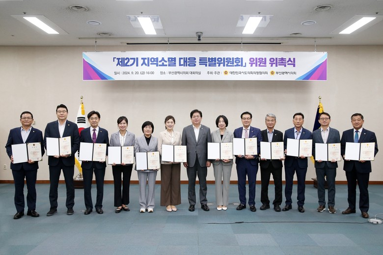 [부산 세계타임즈=이용우 기자] 부산광역시의회는 대한민국시도의회의장협의회‘제2기 지역소멸 대응 특별위원회' 위원 위촉식과 위원장 선출을 위한 임시회를 9월 20일(금) 부산광역시의회 대회의실에서 개최하였으며, 금번 임시회에서는 제1기에 이어 부산광역시 배영숙 의원(부산진구4, (부산광역시의회)지방시대 특별위원회 위원장)이 제2기 위원장으로 선출되었다고 전했다.