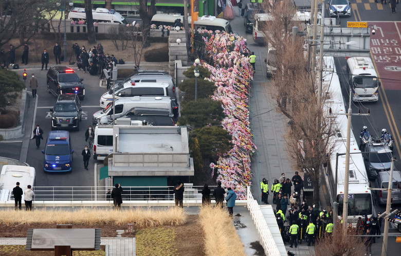 윤석열 대통령이 21일 오후 서울 종로구 헌법재판소에서 탄핵심판 3차 변론을 마친 뒤 서울구치소로 향하고 있다. 2025.1.21