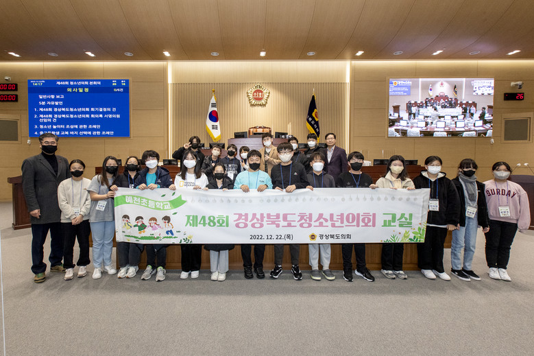[경북 세계타임즈=한성국 기자] 경상북도의회(의장 배한철)는 12월 22일 예천초등학교 학생들이 참가한 “2022년 경상북도청소년의회 교실”을 경상북도의회 본회의장에서 개최 했다.