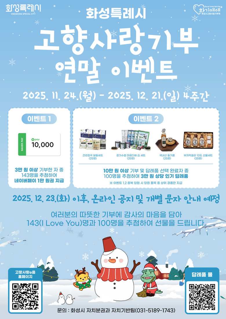 시는 오는 21일까지 3만 원 이상 기부자 중 143명(‘I love you’를 의미하는 숫자 143)을 추첨해 1만 원 상당의 모바일 상품권을 제공하며, 10만 원 이상 기부 후 답례품을 선택한 기부자 중 100명을 추첨해 3만 원 상당의 답례품을 추가 제공한다.