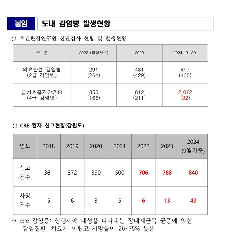 [강원도 세계타임즈=김민석 기자] 농림수산위원회 소속 엄윤순 위원장[인제]은 강원특별자치도(이하 강원도)의 감염병 발생 현황을 받아본 결과, 코로나 이후 의료관련 감염병인 CRE(장내세균목 균종에 의한 감염질환) 환자 증가율이 평균 771건에 달한다며, 예방 홍보 및 관리 대책 강화를 요구하였다.