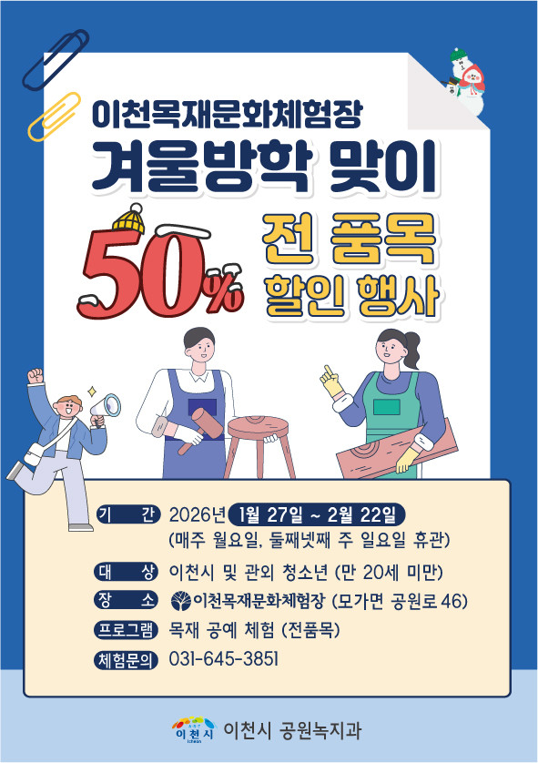 이번 행사는 1월 27일(화)부터 2월 22일(일)까지 이천시 목재문화체험장(이천시 모가면 공원로 46)에서 진행되며, 관내·외 어린이 및 청소년(만 20세 미만)을 대상으로 한다.