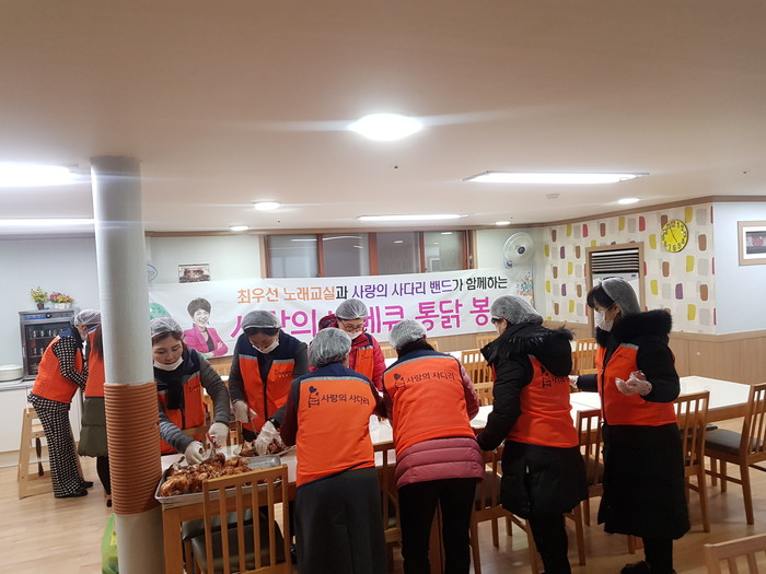 이정제 리더는 “최우선 노래교실과 사랑의 사다리 밴드는 매월1회씩 대전시 5개구 보육원에서 통닭 봉사를 하고 있다.“면서 “3월에는 유성구 장대동에 위치한 천양원에서 봉사를 하기로 했다.”고 말했다.