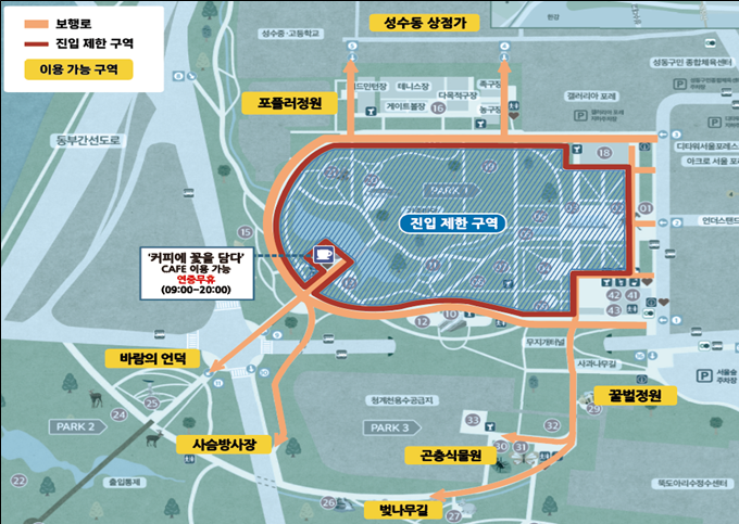다만 서울숲 전체가 제한 되는 것은 아니며, 사슴방사장, 곤충식물원, 갤러리정원, 바람의 언덕과 테니스장·다목적구장 등 체육시설은 기존과 동일하게 이용할 수 있다. 시는 시민 불편을 최소화하기 위해 공사 구간을 한정하고, 현장을 찾은 시민들이 혼란이 없도록 안내를 강화할 계획이다