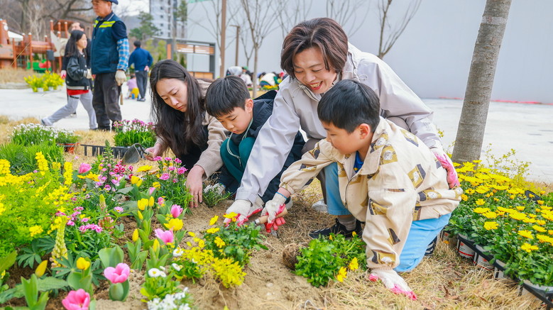 이날 행사에는 신계용 과천시장과 시민, 지역 단체 구성원, 어린이집 원아와 학부모 등이 참여해 공원 내 6개 구역에 꽃을 심었다.