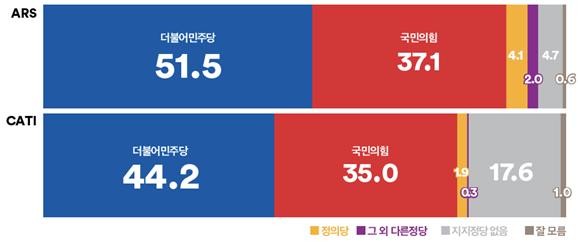 ARS 조사에서 ‘더불어민주당’은 전주 대비 4.5%p 오른 51.5%, ‘국민의힘’은 2.6%p 내린 37.1%를 기록하였다. ‘정의당’도 전주 대비 0.2%p 소폭 하락하여 4.1%, ‘그 외 다른 정당’ 2.0%, ‘지지 정당 없음’ 4.7%, ‘모름/무응답’0.6%를 차지했다.