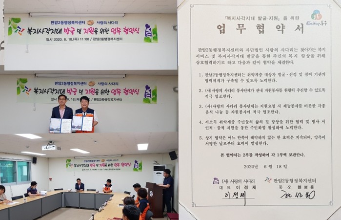 [대전=세계타임즈 이채봉 기자] 대전시 SNS 8천명 봉사단체 사랑의 사다리 밴드(리더 이정제)는 18일 오전11시,동구 판암2동 행정복지센터 2층 회의실에서 복지사각지대 발굴 지원사업 상호협력을 위한 업무협약식을 체결하였다.