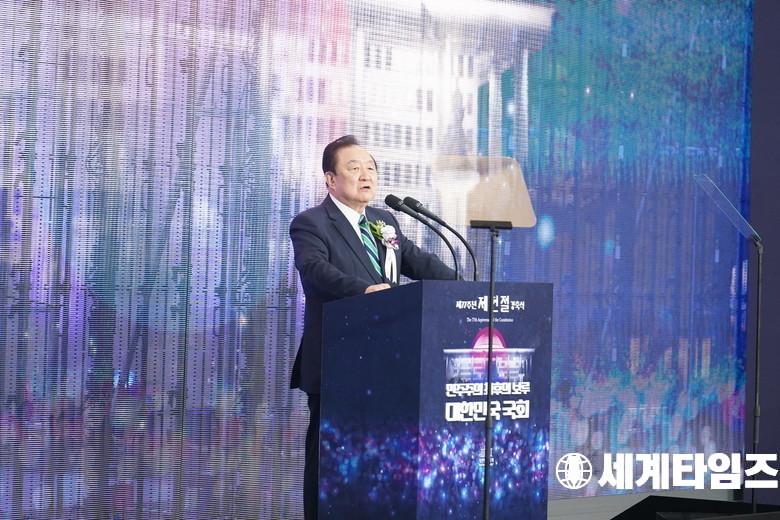 '정대철' 헌정회장이 17일 서울 여의도 국회에서 열린 제77주년 제헌절 기념식에서 기념사를 하고 있다.