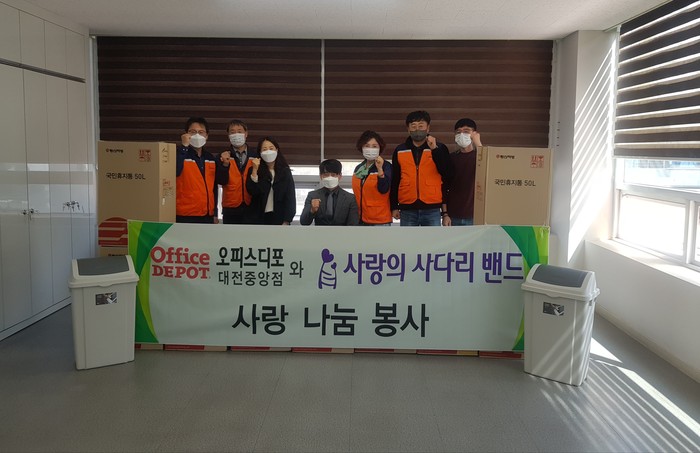 대전시지체장애인협회 서구지회 권준석 회장은 “오늘 사랑의 사다리 밴드와 오피스디포에서 일상생활에 필요한 휴지통을 지원해 주어서 큰 힘과 위안이 된다.”면서 감사함을 전했다.