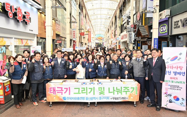 [중구 세계타임즈=이호근 기자] 한국자유총연맹 울산중구지회(회장 장해식)가 2월 28일 오후 2시 성남동 젊음의 거리 일대에서 제106주년 3.1절 맞이 ‘나라사랑 홍보 활동(캠페인)’을 진행했다.