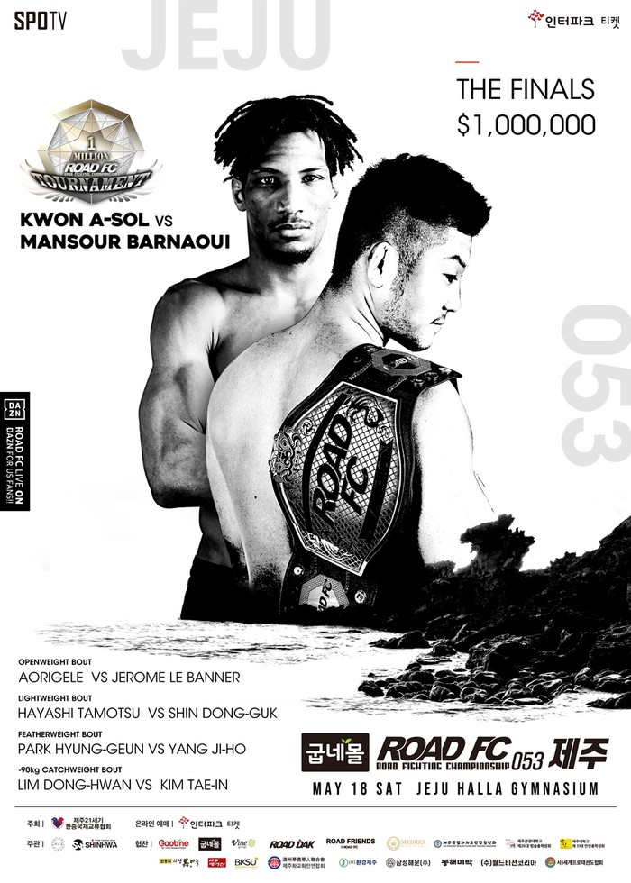 [세계타임즈 김인수기자] ROAD FC(로드FC)는 오는 5월 18일 제주 한라체육관에서 굽네몰 ROAD FC 053 제주를 개최한다. 메인 이벤트로는 ‘끝판왕’ 권아솔(33, 팀 코리아 MMA)과 만수르 바르나위(27, TEAM MAGNUM/TRISTAR GYM)의 100만불 토너먼트 최종전이 펼쳐진다. 아시아 역대 최대 규모의 상금과 권아솔의 라이트급 챔피언 벨트가 걸린 대결로 많은 관심을 받고 있다.