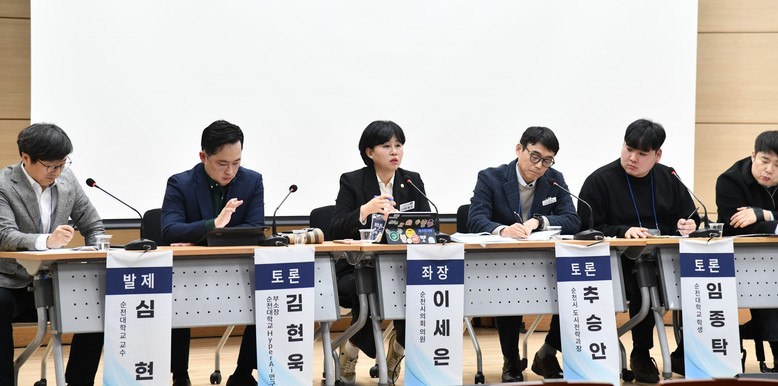 이어진 토론에서는 순천시의회 스마트시티 구축 연구모임 회장인 이세은 의원이 좌장을 맡아 진행했으며, 순천시의회 유승현 의원, 국립순천대학교 HyperAi 연구소 김현욱 부소장, 순천시 추승안 도시전략과장, 국립순천대학교 임종탁 학생이 토론자로 참여해 AI를 접목한 도시 전략과 행정.교육.산업 등 다양한 분야의 연계 방안에 대해 폭넓은 의견을 나눴다.