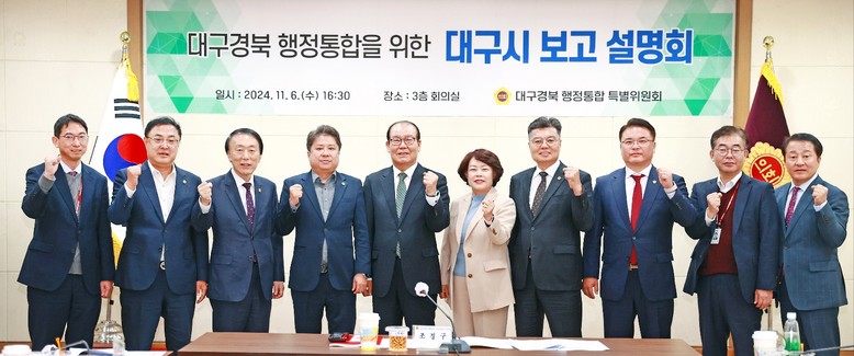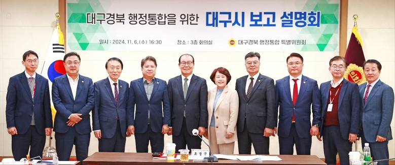 [대전 세계타임즈=한윤석 기자] 대구시의회 대구경북 행정통합 특별위원회(위원장 조경구)는 11월 6일(수) 시의회 3층 회의실에서 행정통합에 대한 설명회를 열었다. 이번 설명회는 대구시 관계 부서로부터 홍보 및 의견 수렴 현황을 보고받고, 행정통합에 대한 시민들의 공감대 형성과 주민 여론을 파악하는 자리였다.