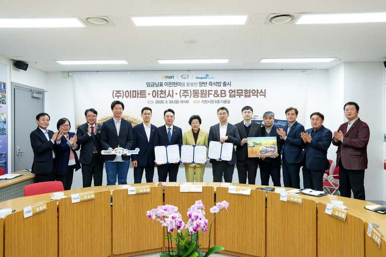 [이천시 세계타임즈=송민수 기자] 이천시(시장 김경희)는 3월 30일 이천시청에서 ㈜동원F&B, ㈜이마트와 함께 ‘임금님표이천 현미 즉석밥’ 출시를 위한 업무협약(MOU)을 체결하고, 쌀 소비 촉진과 농업인 소득 안정화를 위한 협력체계를 구축했다고 밝혔다.