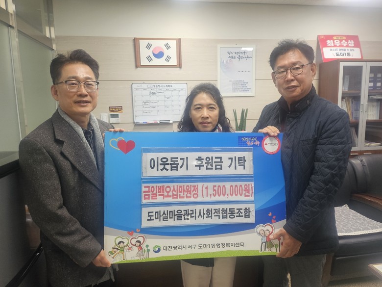 [서구 세계타임즈=이채봉 기자] 대전 서구 도마1동 행정복지센터는 30일 도마실마을관리사회적협동조합(대표 정종선)으로부터 이웃돕기 성금 150만 원을 전달받았다.