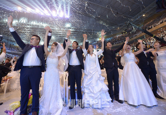 이날 미국, 영국, 독일, 이탈리아, 일본, 호주, 싱가포르, 필리핀, 네팔, 러시아, 아르헨티나, 콜롬비아, 요르단, 수단, 남아프리카공화국 등 64개국 4000여쌍과 인터넷 생중계를 통해 194개국에서 동참한 2만여쌍 등 모두 2만 4000여쌍의 신랑신부가 동시에 식을 올렸다. 2017.09.07.