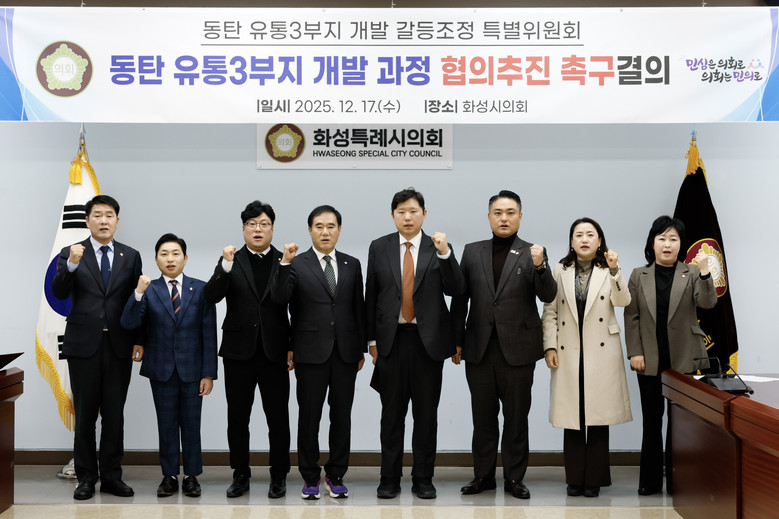 [화성시 세계타임즈=송민수 기자] 화성특례시의회 「동탄 유통3부지 개발 갈등조정 특별위원회」(이하 특별위원회)는 17일 의회 대회의실에서 동탄 유통3부지 개발과정 협의추진 촉구결의를 진행했다.
