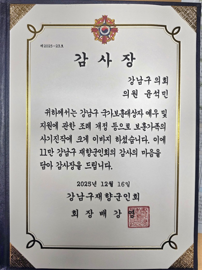 윤석민 의원은 감사장 수상과 관련해 “국가를 위해 헌신한 분들과 그 유족의 명예를 지키고 보훈복지를 강화하는 일은 지방의회의 중요한 책무”라는 인식을 전하며, 앞으로도 강남구 차원의 보훈 정책이 현장에서 실질적으로 체감될 수 있도록 지속적인 관심과 노력을 이어가겠다는 뜻을 밝혔다.