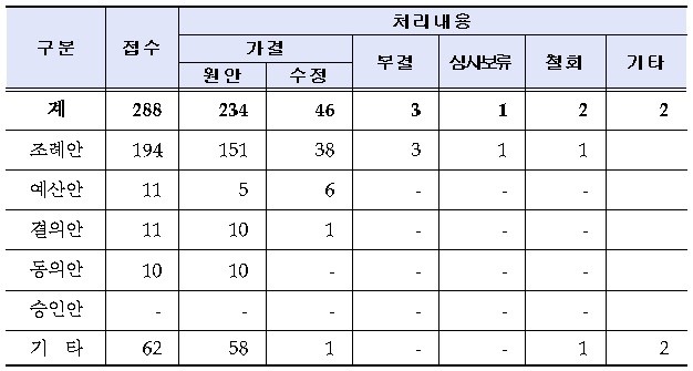 의안은 총 288건이 접수되어 원안가결 234건, 수정가결 46건 등으로 처리했으며, 의안 종류별로는 조례안 194건, 예산안 11건, 결의안 11건, 동의안 10건, 기타 62건 등이다.