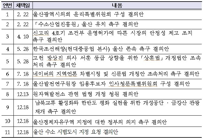 시의회는 ‘「수소산업진흥원」울산 유치 촉구 결의안’을 비롯하여 ‘신고리 4호기 조건부 운영허가에 따른 시장의 안정성 제고 조치 촉구 결의안’, ‘고헌 방상진 의사 서훈 등급 상향을 위한「상훈법」개정법안 조속처리 촉구 결의안’ 등 총 11건의 결의안을 발의하여 모두 원안가결 했다.