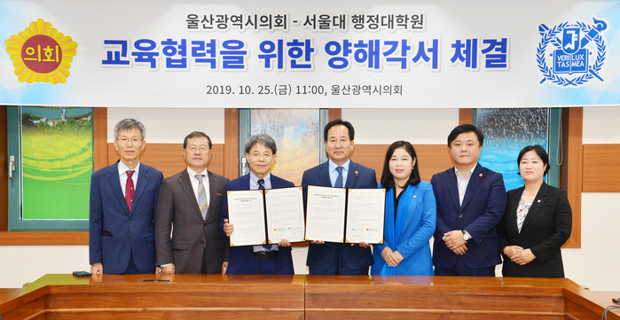 울산시의회(의장 황세영)는 올해 10월 25일, 서울대 행정대학원(원장 임도빈)과 양 기관의 상호협력 및 미래지향적인 발전을 위해 양해각서(MOU)를 체결했다. 이 양해각서는 자치분권시대를 맞아 의원들의 대시민 활동에 대한 요구가 높아짐에 따라 이에 선제적으로 대응하기 위한 것으로, 울산시의회와 서울대 행정대학원간 공동연구 수행, 공청회.토론회 개최 협력, 학술연구, 의원 교육과정 운영 등 상호 교류와 협력에 크게 기여할 것으로 기대된다.