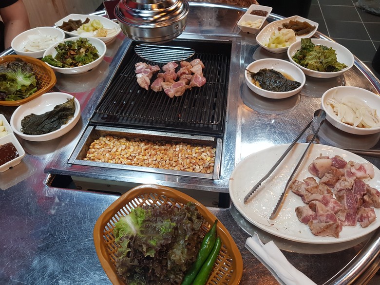 ‘마포주먹구이’집에는 노란 옥수수 불에 구워 먹는 '돼지고기'는 일반 고깃집과는 차별이 다른 점이 있다. 불판에 얹어 그냥 구워 먹는 고기가 아니고 주방에서 초벌구이하여 잘라서 나오면 그때 불판에 구워 먹는 고기맛은 일품에 가깝다.