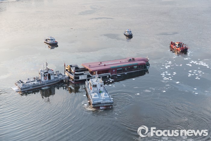 (서울=포커스뉴스) 26일 오후 서울 한강 영동대교 아래에서 소방대원들이 침수된 한강유람선 견인 작업을 하고 있다.