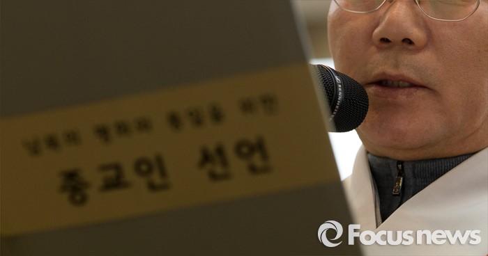 (서울=포커스뉴스) 29일 오후 서울 중구 프레스센터에서 '3.1 운동의 정신을 이어 민족의 평화와 화해, 신뢰회복을 위한 종교인 기자회견'에 참석한 지홍 스님이 성명서를 낭독하고 있다.
