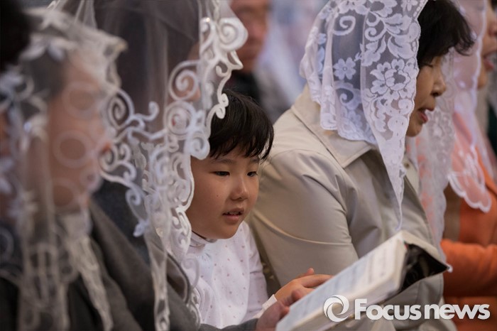 (서울=포커스뉴스) 부활절을 맞아 27일 정오 서울 중구 명동성당에서 열린 '예수 부활 대축일 미사'에 신도들이 참석해 있다.