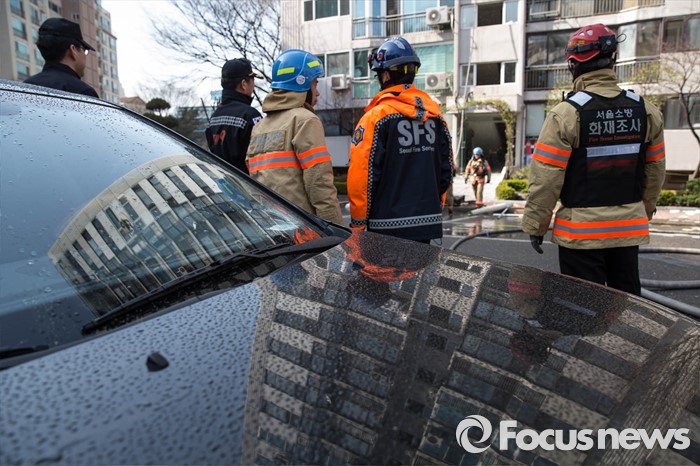 (서울=포커스뉴스) 30일 오후 2시께 서울 서초구의 한 아파트에서 원인모를 불이나 소방관들이 진화작업을 하고 있다.