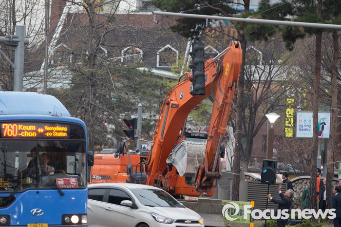 (서울=포커스뉴스) 6일 오후 서울 은평구 연신내 물빛공원에서 고연호 국민의당 은평구을 후보의 유세가 끝나고 철수하던 포크레인이 신호등을 건드려 망가졌다.