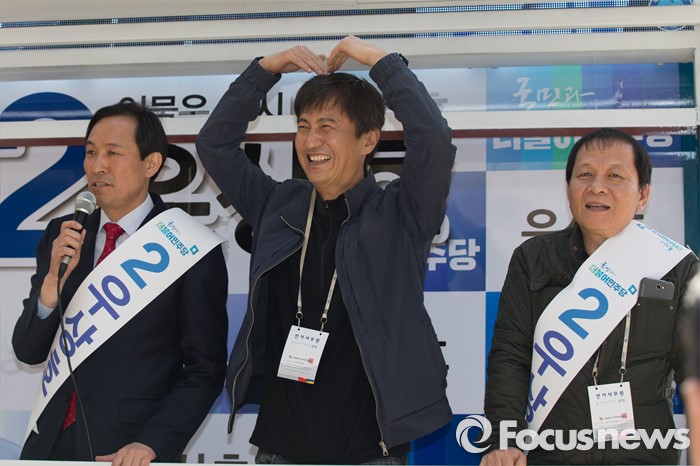 (서울=포커스뉴스) 11일 오후 서울 서대문구 청소년수련관 앞에서 우상호 더불어민주당 서대문구갑 후보가 영화배우 안내상, 우현과 함께 유세를 하고 있다.