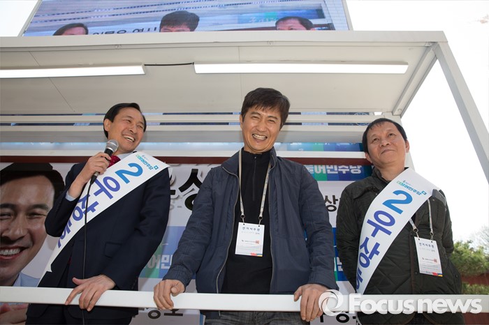 (서울=포커스뉴스) 11일 오후 서울 서대문구 청소년수련관 앞에서 우상호 더불어민주당 서대문구갑 후보가 영화배우 안내상, 우현과 함께 유세를 하고 있다.