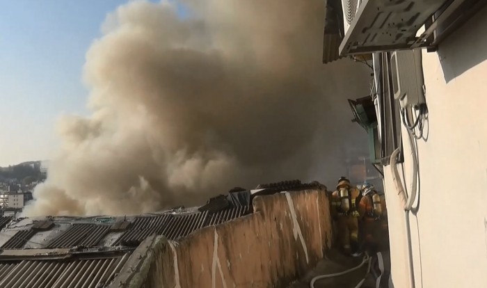 경찰과 소방당국은 재개발구역 내 무허가 주택에서 처음 불이 시작된 것으로 보고 정확한 화재원인을 조사 중이다.서울 서대문구 북아현동의 재개발구역에서 불이 나 소방대원들이 진화 중이다. <사진제공=서울 서대문소방서>