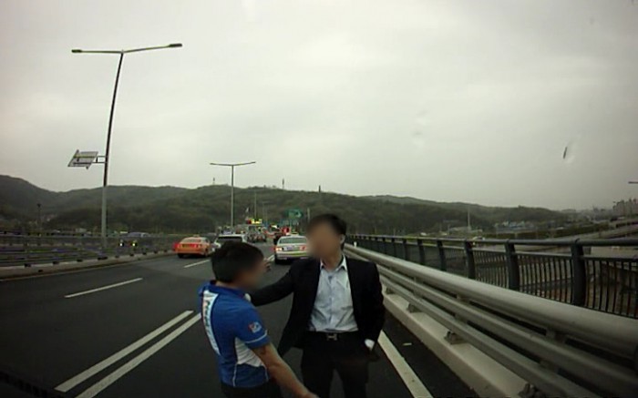경찰 관계자는 "한씨는 군복무시절 특공 무술을 배웠고 평소에 단검술 연습을 하기 위해서 나무 단검을 소지했다"고 밝혔다.서울 올림픽대로 암사대교 합류지점에서 화물차운전사 윤모(36)씨와 외제차 운전자 한모(49)씨가 말다툼을 하고 있다. <사진제공=서울 노원경찰서>