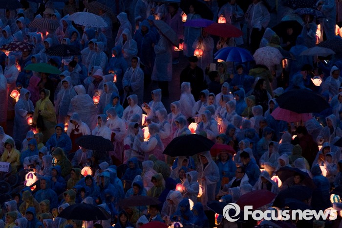 (서울=포커스뉴스) 20일 오후 서울 종로구 광화문 광장에서 부처님오신날(5월 14일)을 앞두고 봉축행사의 일환인 '사사자 삼층석탑등 점등식'이 열리고 있다.