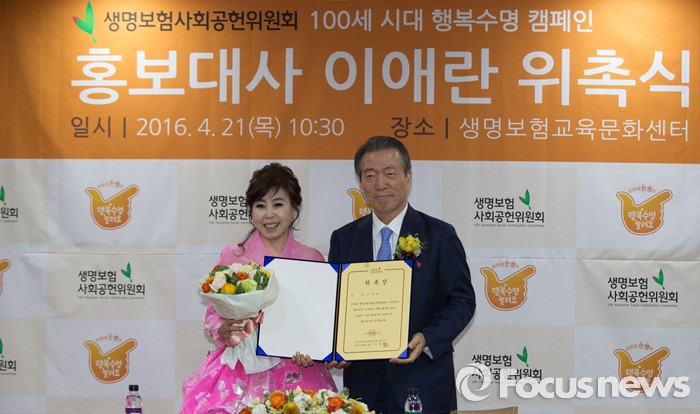 (서울=포커스뉴스) 21일 오전 서울 종로구 센터포인트빌딩에서 열린 '생명보험사회공헌위원회 '100세 시대 행복수명 캠페인' 홍보대사 위촉식에 참석한 가수 이애란과 이수창 공동위원장이 기념 사진을 찍고 있다.